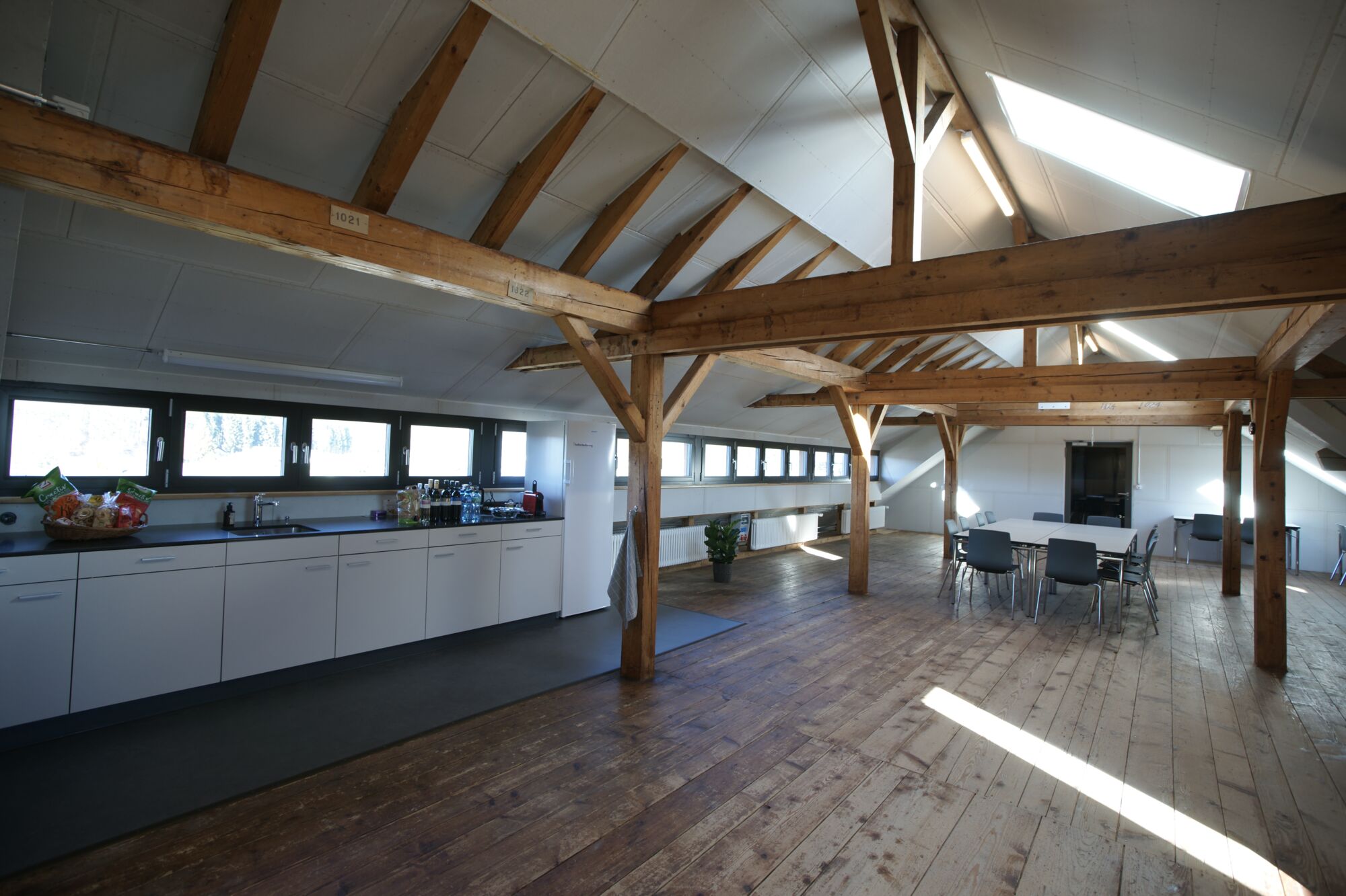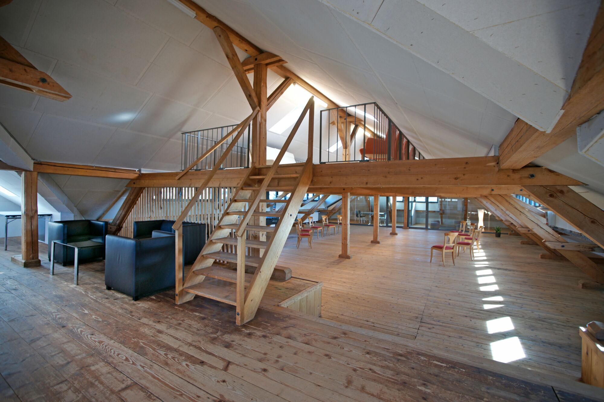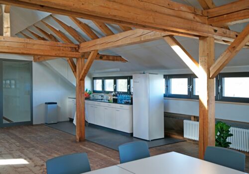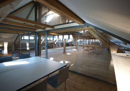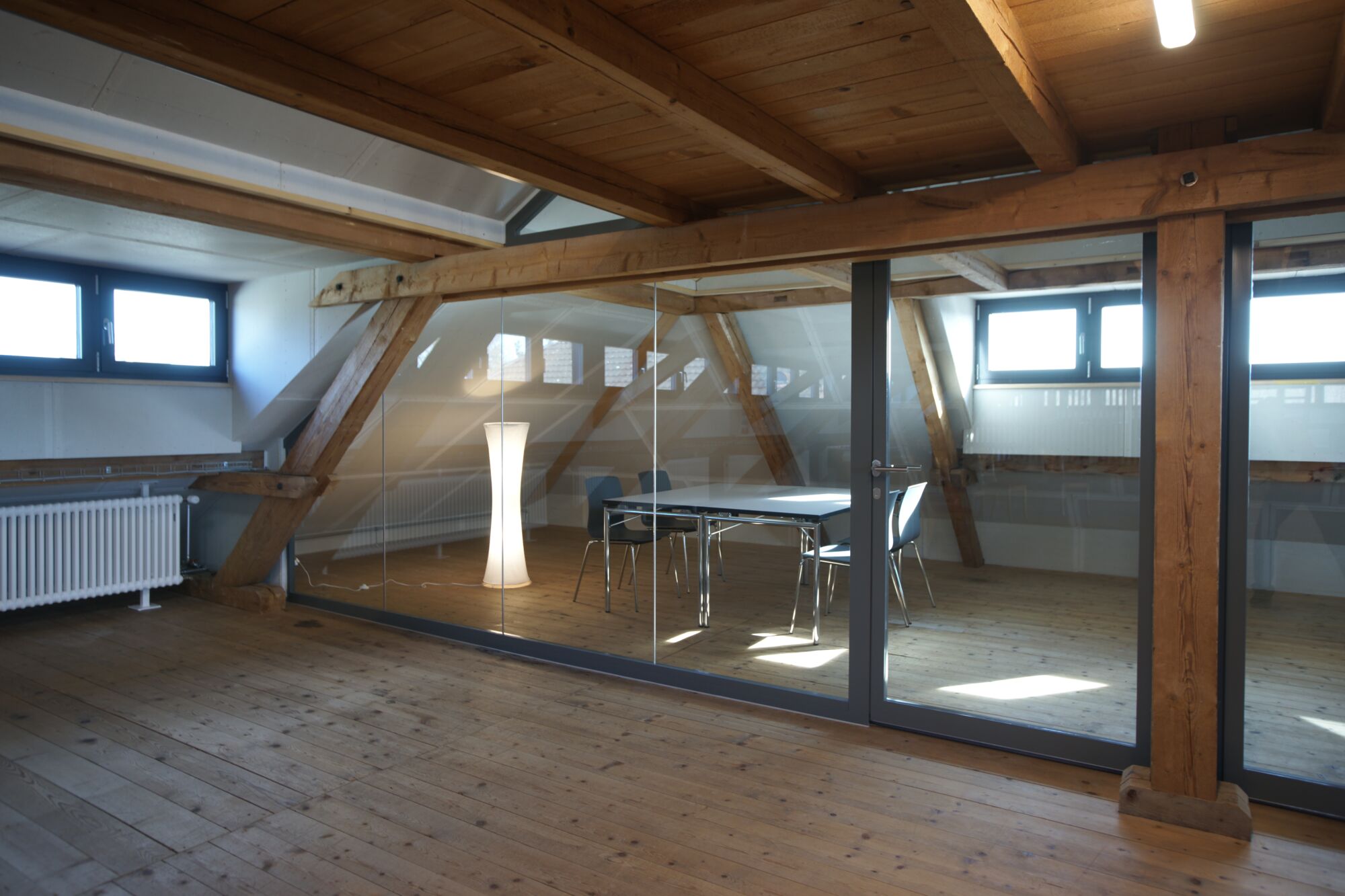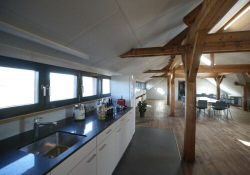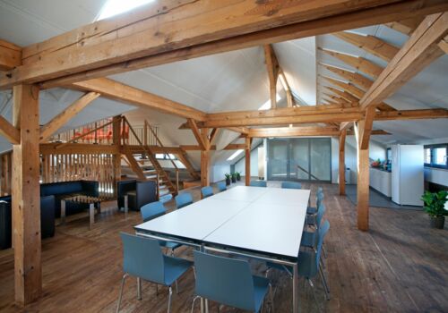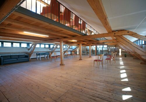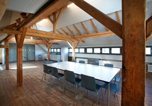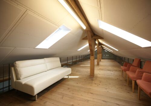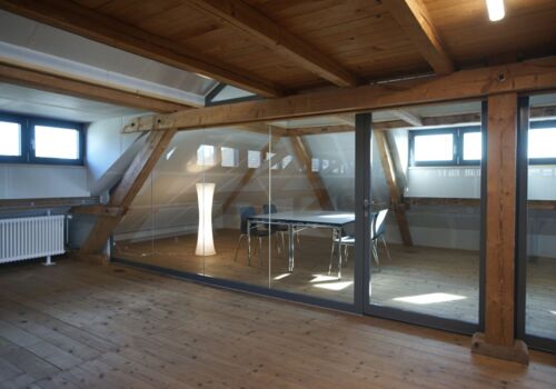 Der Raum liegt im Dachstock der um ca. 1870 erbauten ehemaligen Schuhfabrik.
