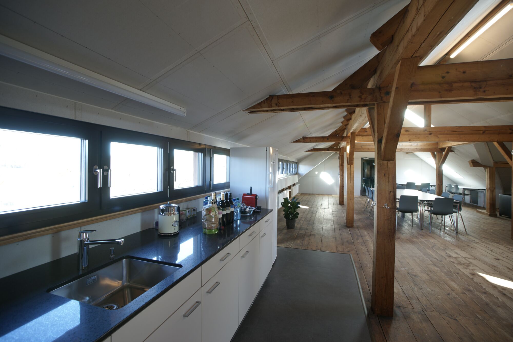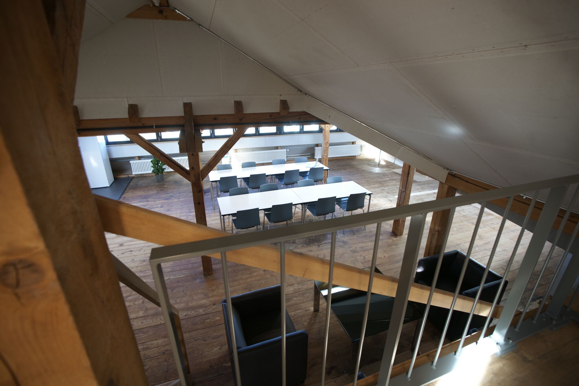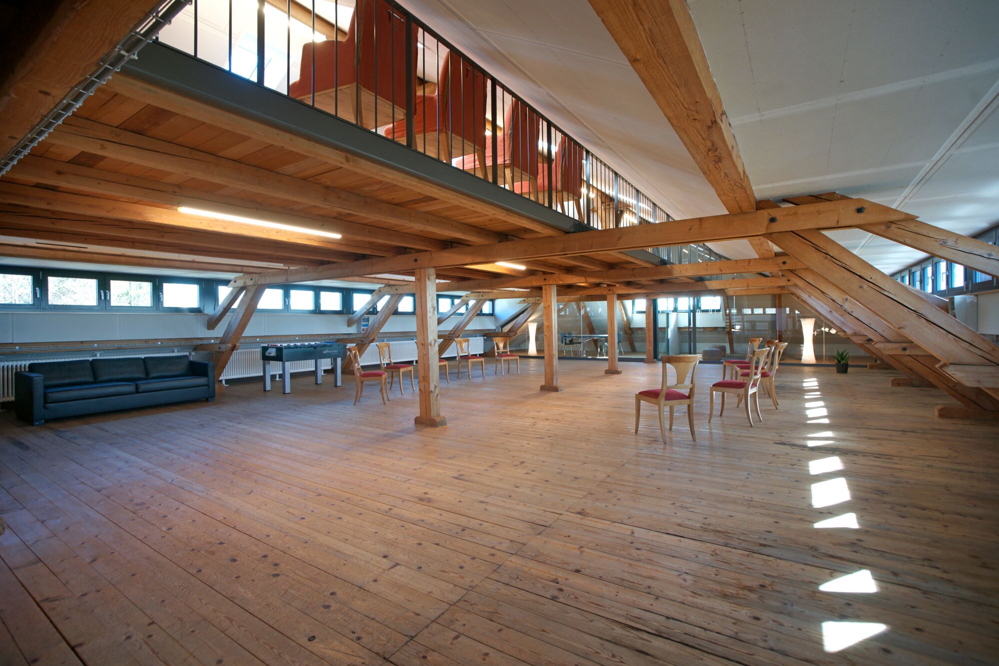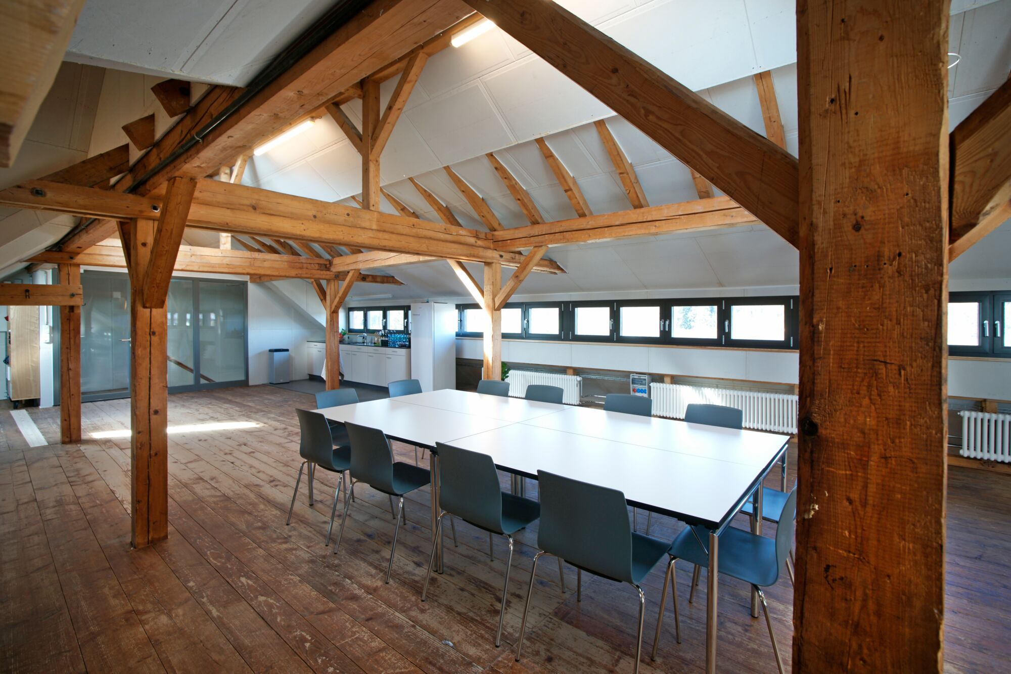 Der Raum liegt im Dachstock der um ca. 1870 erbauten ehemaligen Schuhfabrik.