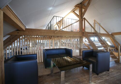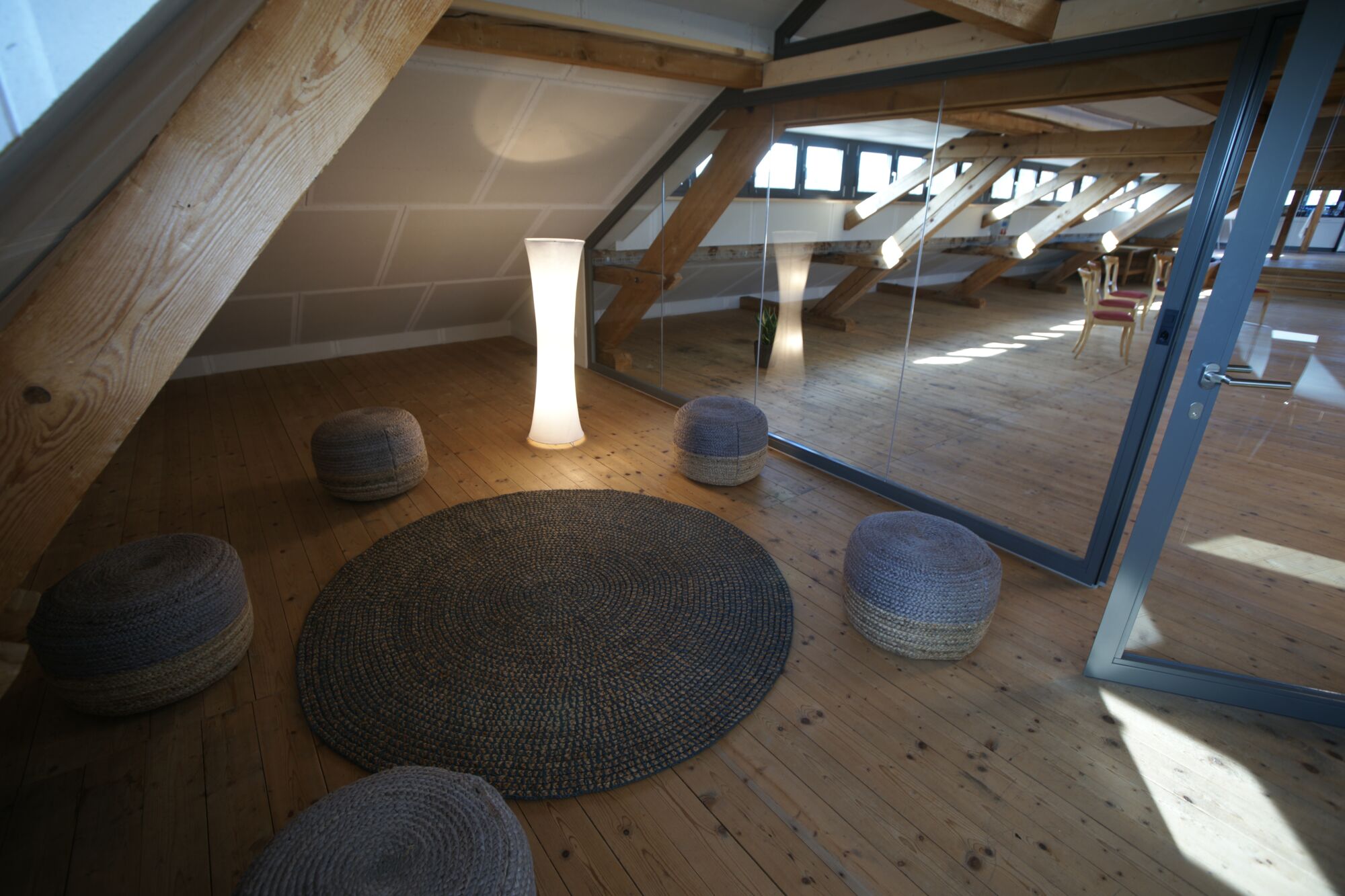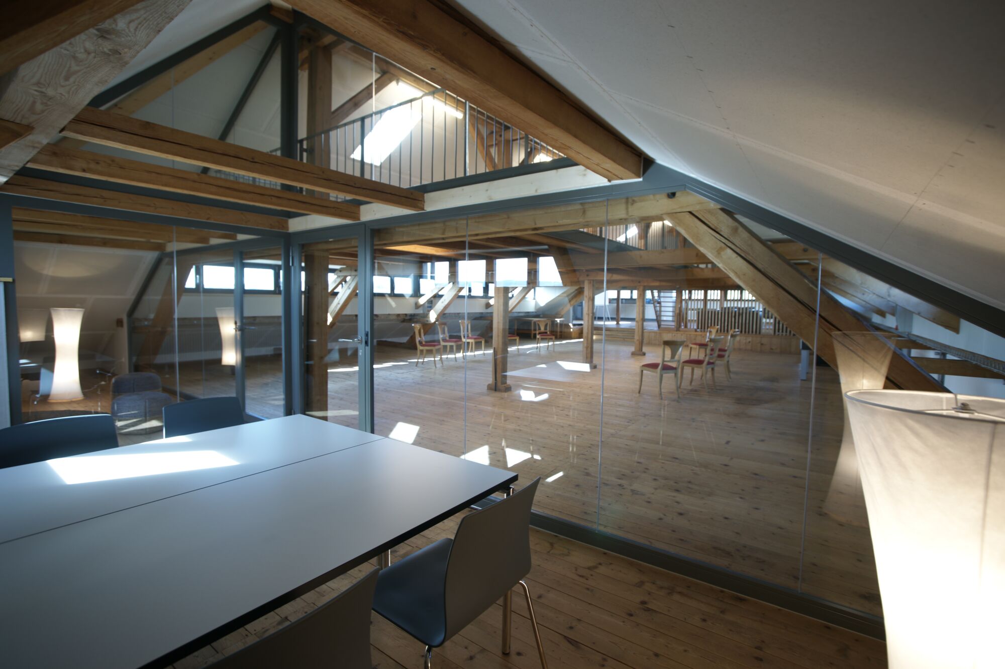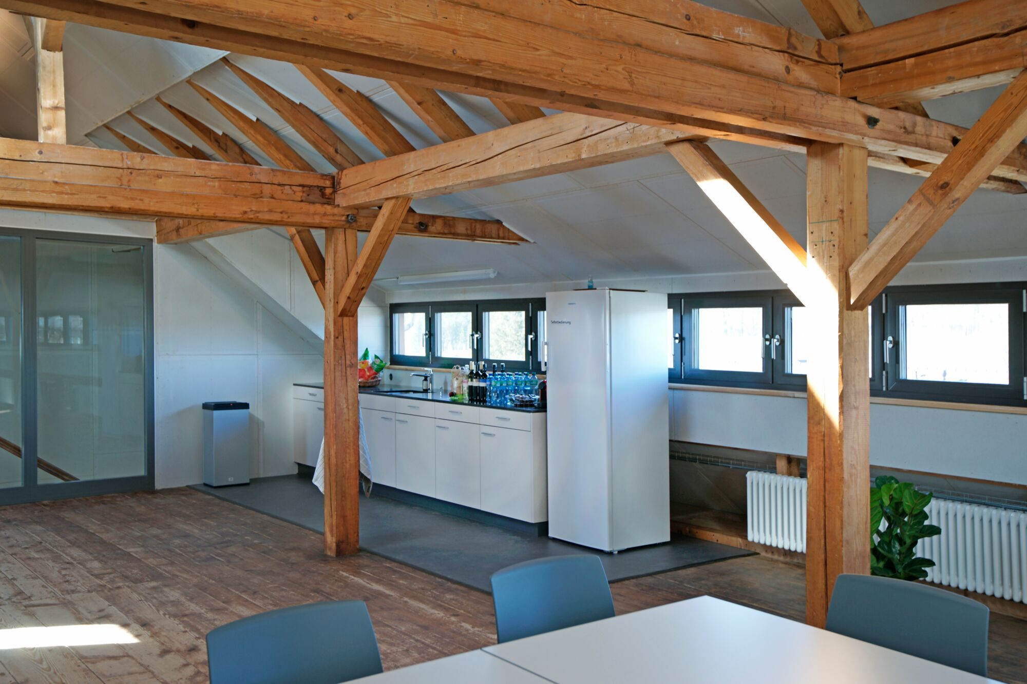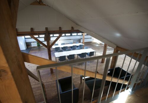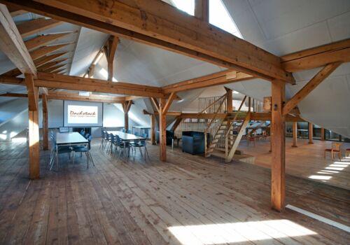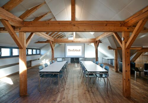 Der Raum liegt im Dachstock der um ca. 1870 erbauten ehemaligen Schuhfabrik.