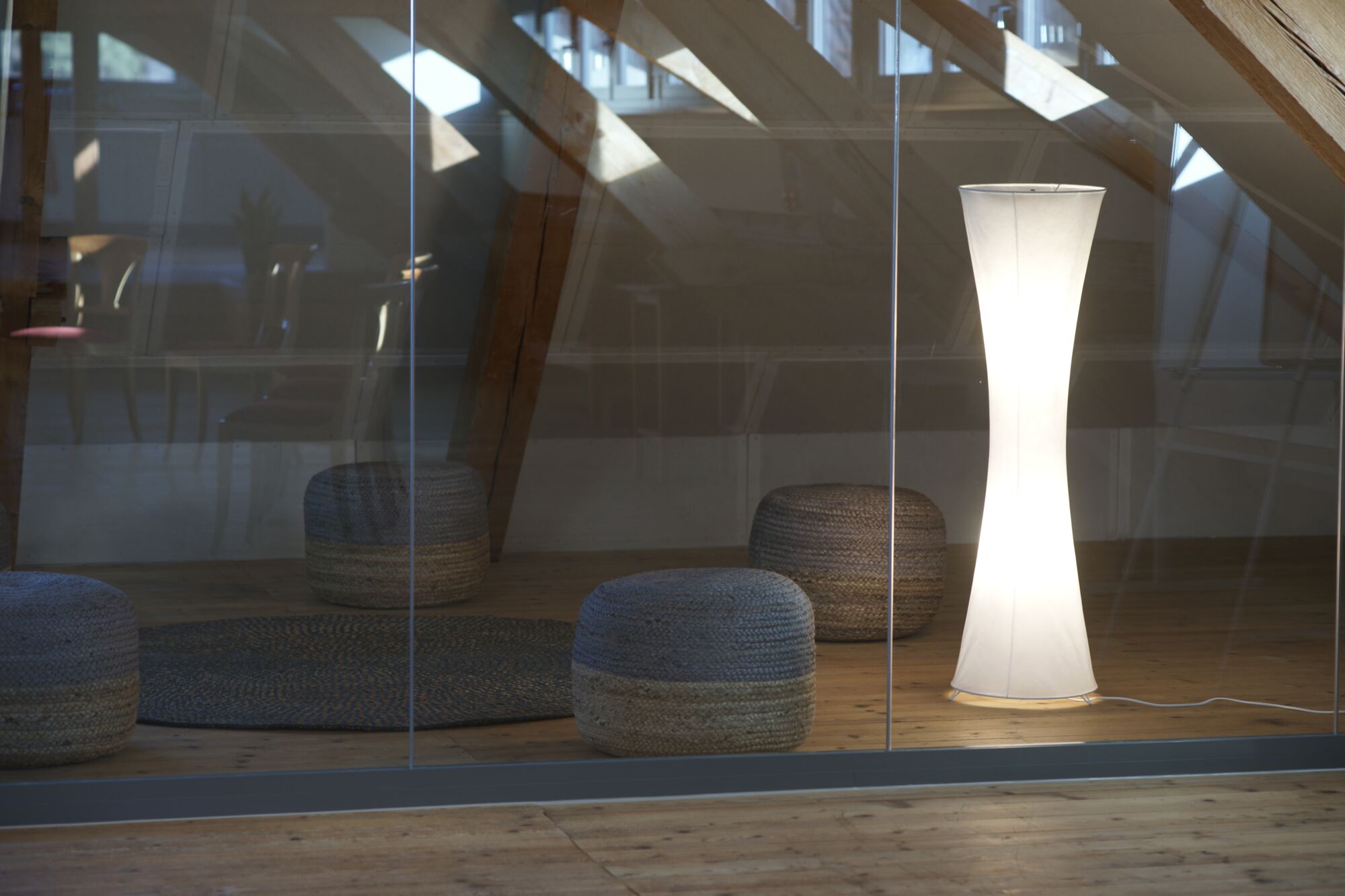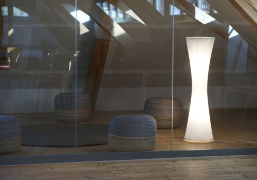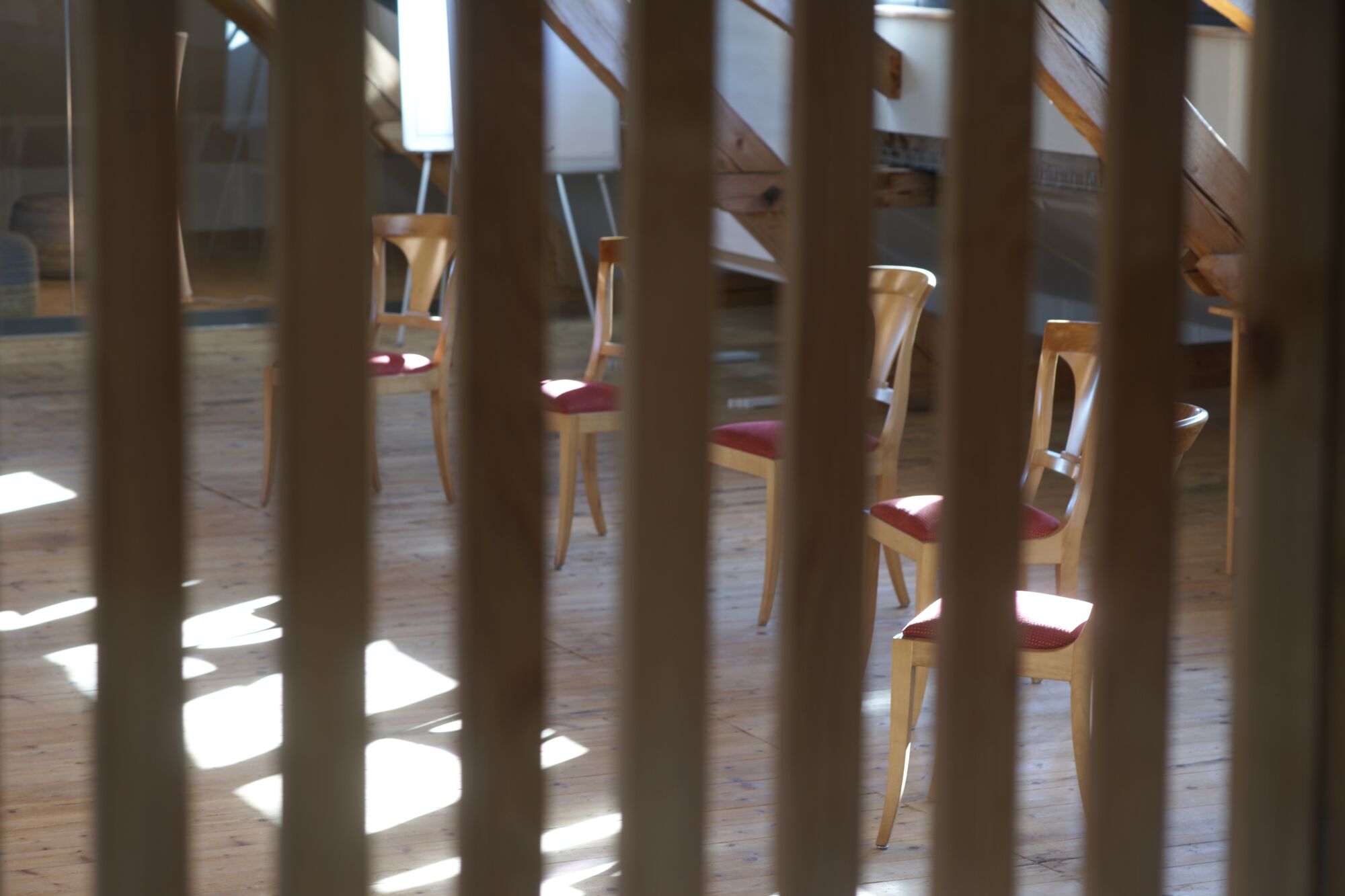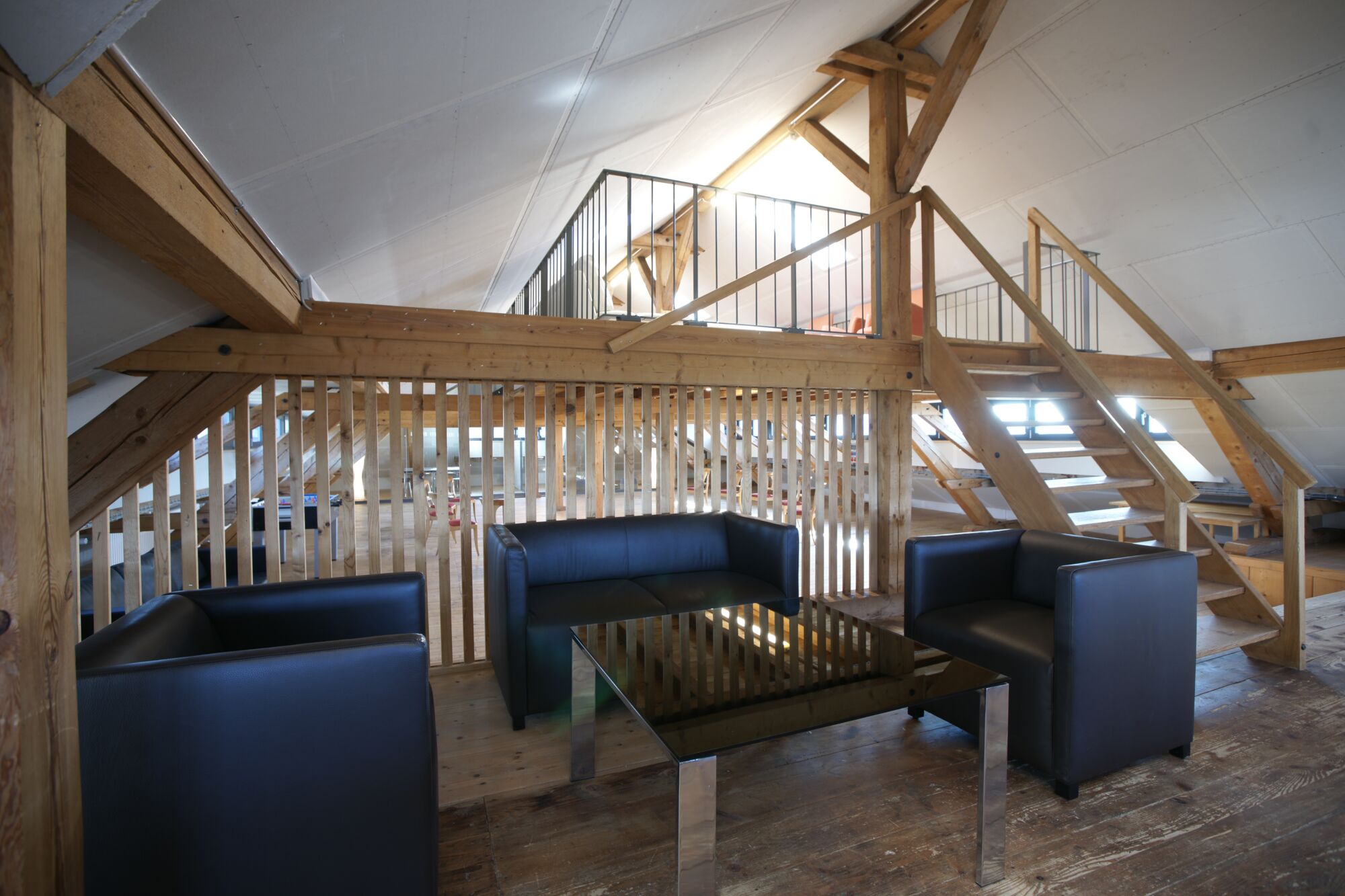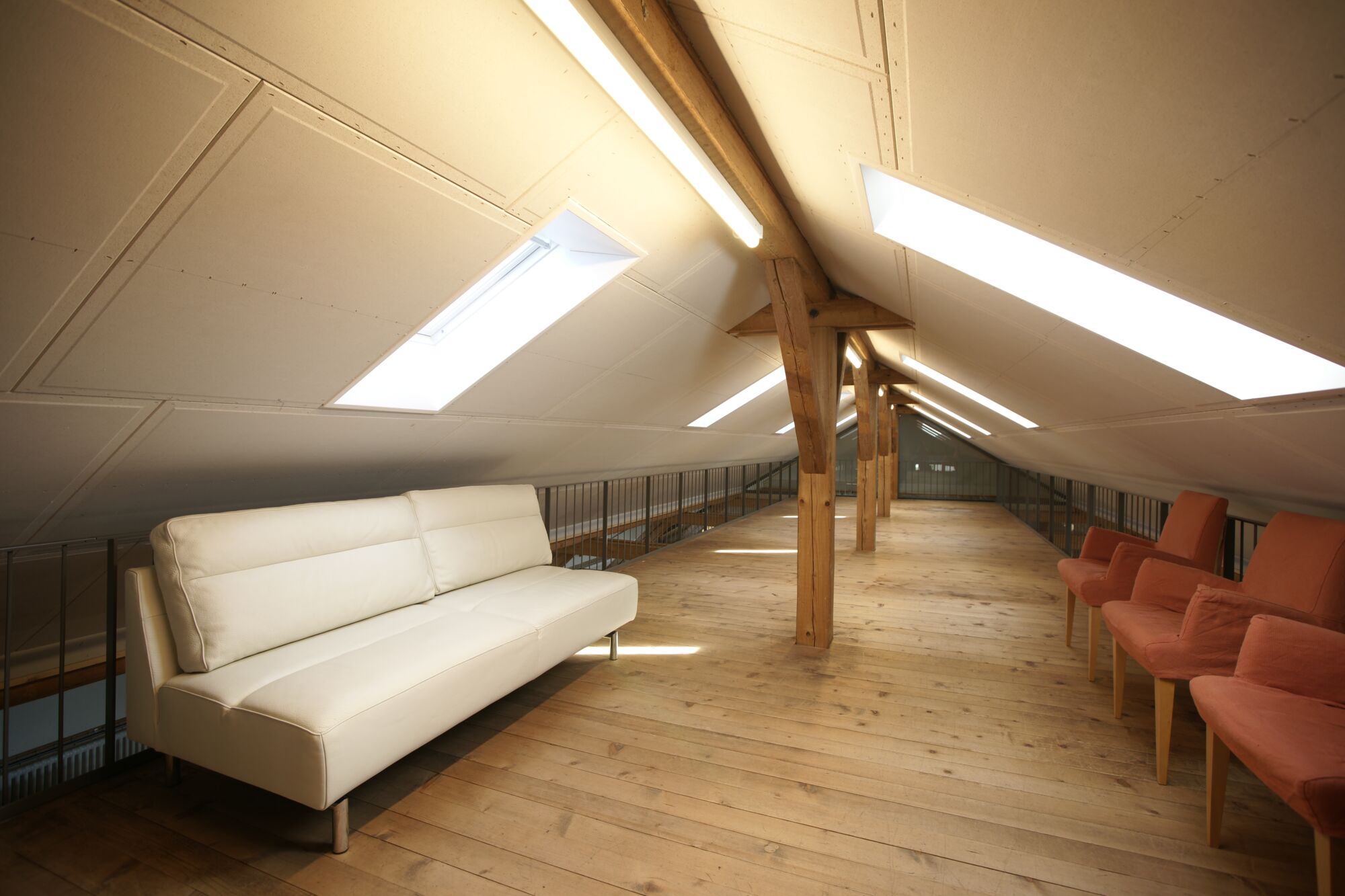 Der Raum liegt im Dachstock der um ca. 1870 erbauten ehemaligen Schuhfabrik.